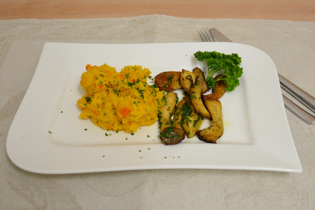 Kräuterseitlinge mit Kürbis-Kartoffel-Püree