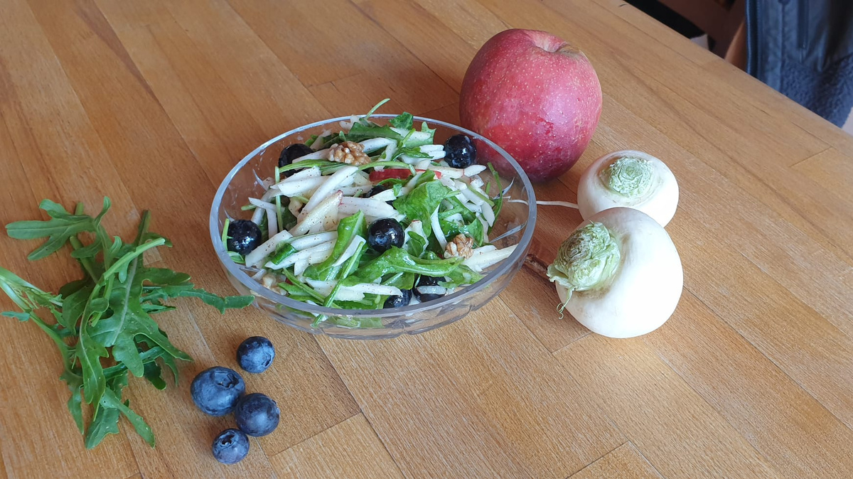 Walnussbruch evtl. noch zerkleinern, zusammen mit Mairübchen und Äpfeln mit der Sauce vermischen.