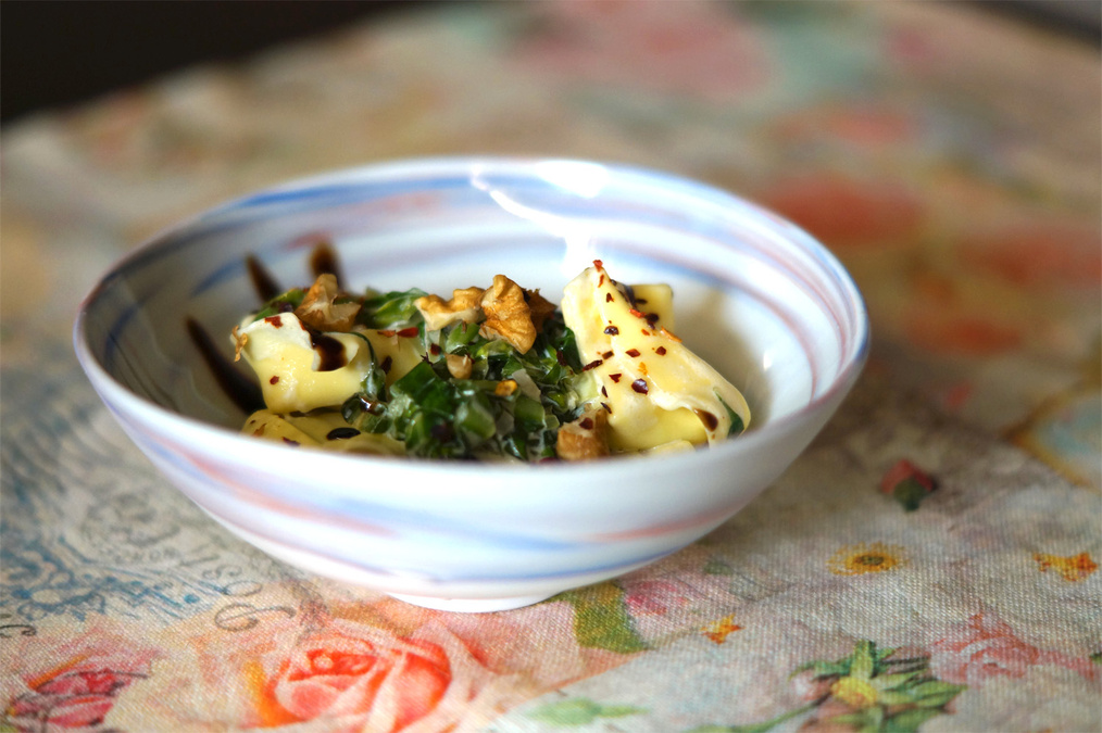 Die Tortelloninach Packungsangabe kochen, danach in der Pfanne mit der Soße durchschwenken. Walnusskerne hacken, darüber streuen und genießen.